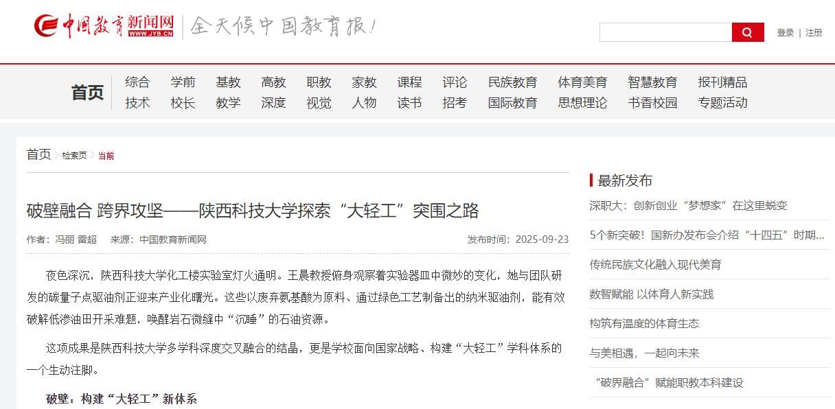 9月23日,中國教育新聞網報道陜西科技大學探索“大輕工”突圍之路:破壁融合 跨界攻堅。