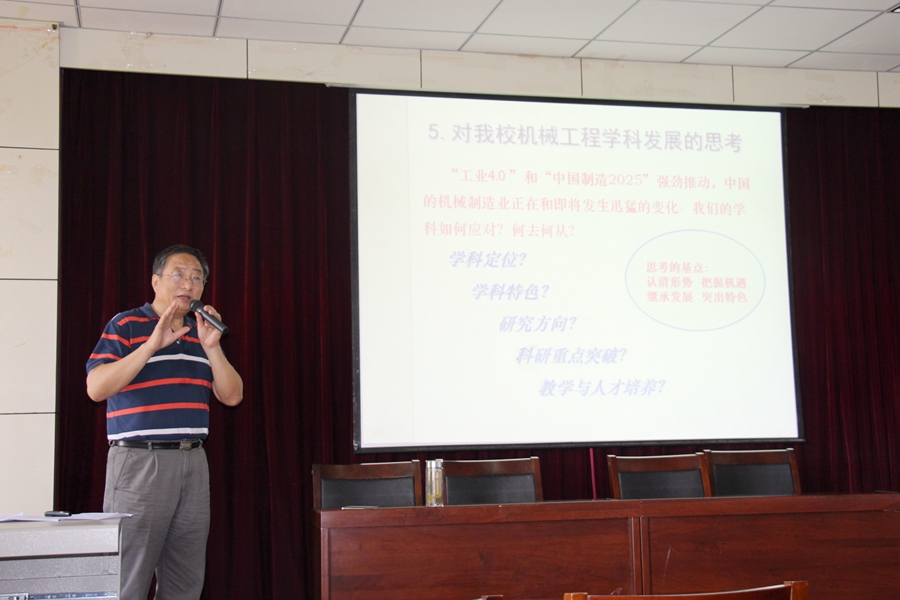 報告開始,曹巨江教授首先提出我國機械裝備制造業面臨的機遇與挑戰以及如何發展的問題,然后就“工業4.0”和“中國制造2025”的概念與戰略要點進行了解讀。隨后,他結合學校和學院的實際情況,引導全院教師在認清形勢、把握機遇、繼承發展、突出特色的基礎上對我校機械工程學科發展進行思考。