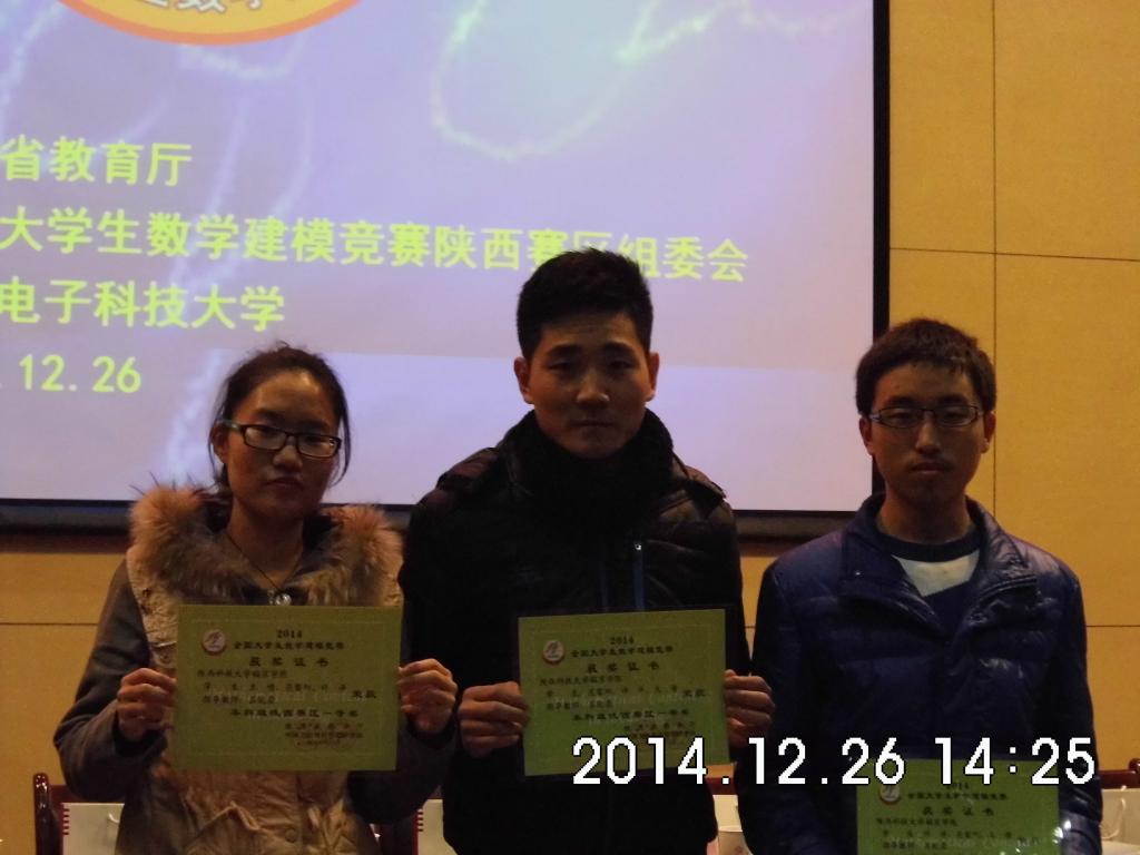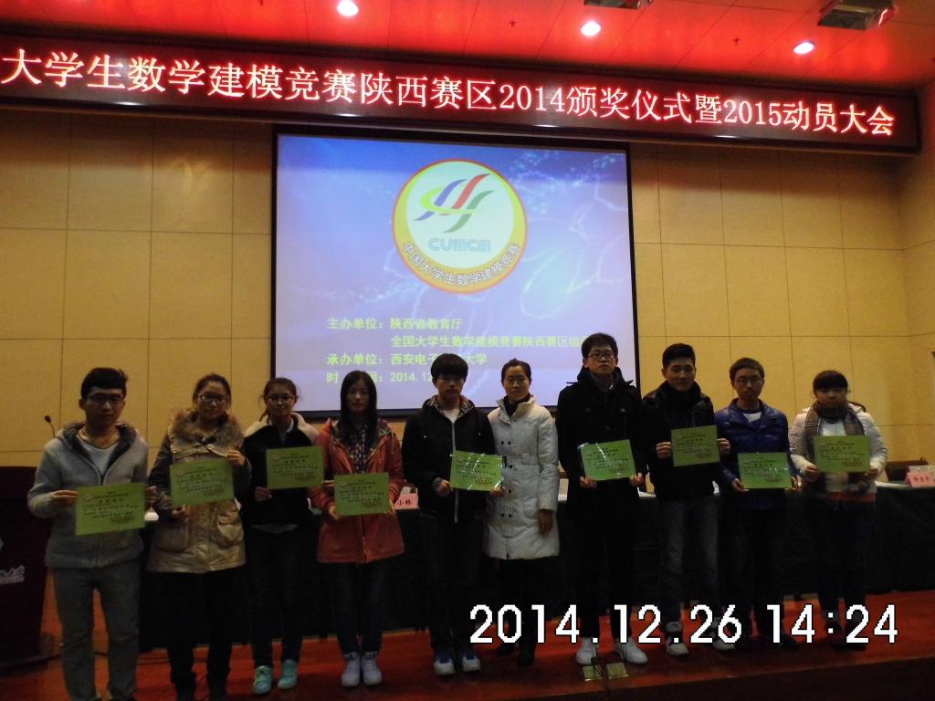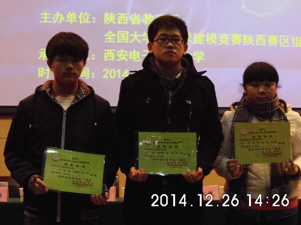2014年學院首次組織學生參加全國大學生數學建模競賽和數學競賽,隊員主要從高數基地班中選拔,共12名學生組成4支隊伍參加建模競賽,239名同學參加數學競賽,并統籌聘請陜西科技大學的優秀建模教練組和學院的優秀青年教師對參賽學生進行暑期集中培訓、輔導及后期強化訓練。歷經1個多月緊張學習,同學們同心協力、團結拼搏、不畏困難,最終取得了優異的成績,為學院贏得了榮譽。