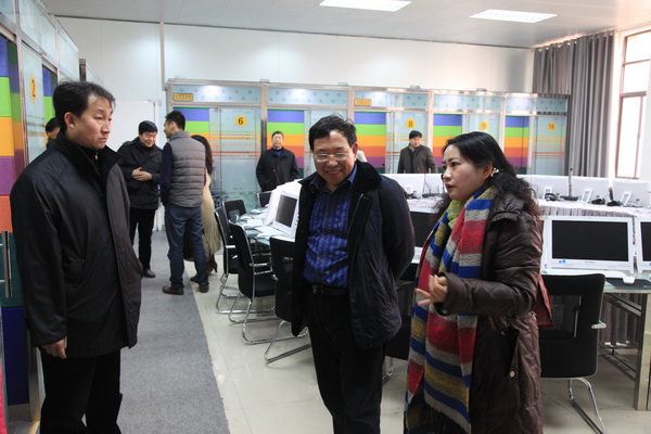 省教育廳語言文字工作處副處長劉白燕(右一)在副校長姚書志(右二)等陪同下在我校計算機輔助普通話水平測試站現(xiàn)場考察