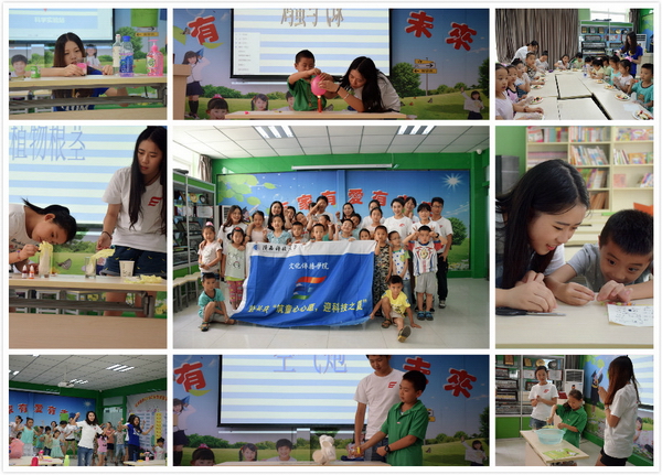 活動開始,實踐團成員們利用破冰游戲,很快和孩子們打成一片。七天時間里,他們首先帶領孩子們一起發現生活中的科學奧秘,通過“空氣炮”、“氣球實驗”、“雞蛋實驗”、“水與紙片”等有趣的科學現象,讓孩子們親身體會“壓強、氣壓、密度、熔點”這些復雜的物理術語,還通過“能浮的雞蛋”、“植物的根莖”、“液體分層”等小實驗,用科學原理回答孩子們熟悉的生活現象,讓孩子們明白科學其實就在身邊,以此來激發他們的探索欲。其次,社會實踐隊還以“成長紀念冊,光陰駐足光影”為主題,記錄7天中每個小朋友的生活點滴,分批對孩子們進行簡單的采訪,鏡頭前每個小朋友的笑容都無比的可愛與真誠。最后,實踐團隊還為孩子們放映動畫片《消防大本營》,以小朋友喜歡的方式幫他們樹立地震和火災安全意識,進行地震和消防逃生演練。在實踐最后一天,通過各種課程的分組比拼來檢驗小朋友們的學習成果,每組小朋友都竭盡全力為自己小組爭先搶答,賽場上氣氛熱烈。
