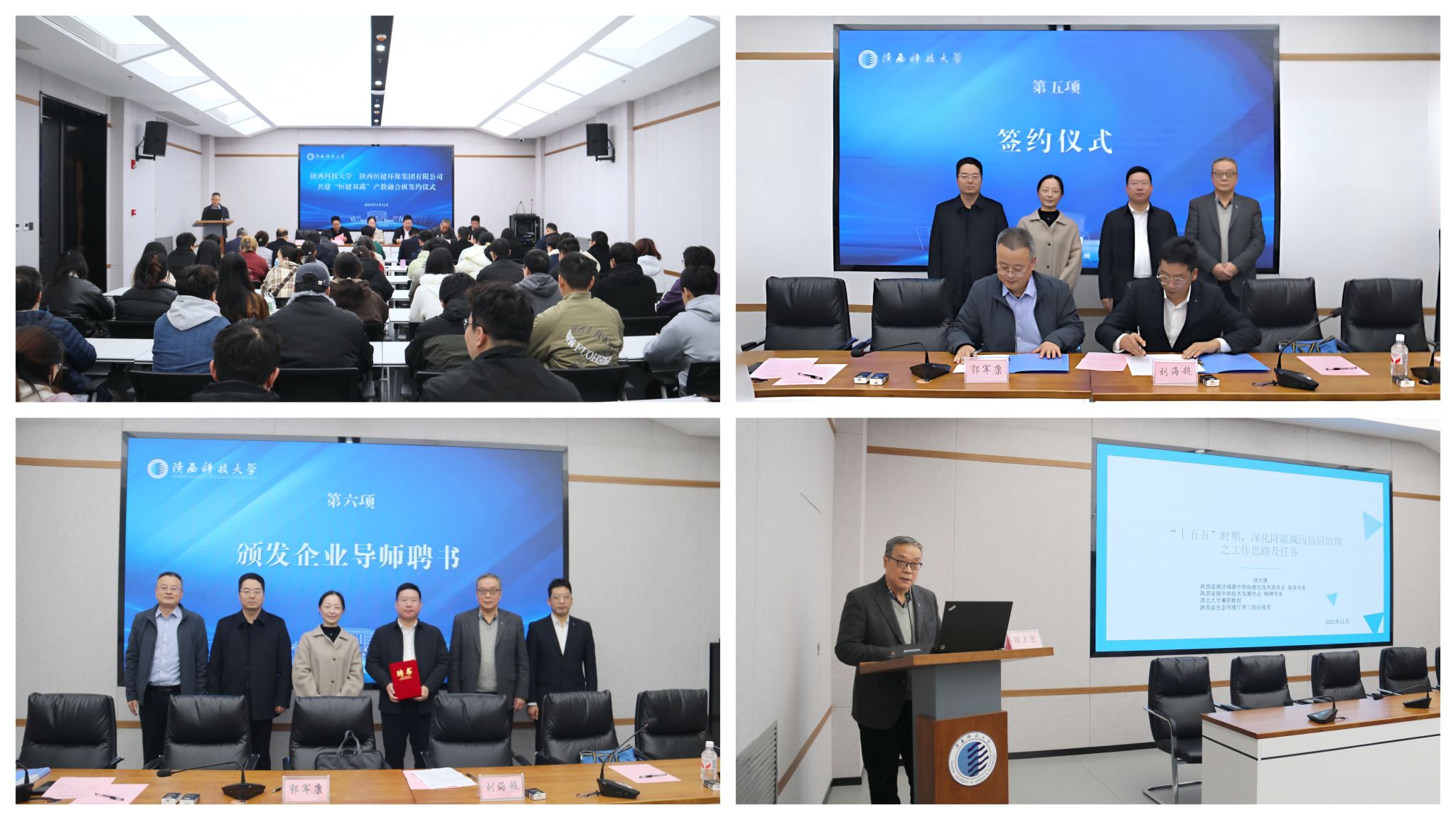 11月11日,環境科學與工程學院(碳中和科學與技術學院)與陜西恒健環保集團有限公司共建“恒健雙碳”產教融合班簽約儀式在至誠至博會議中心舉行。校黨委副書記、紀委書記、監察專員羅瑩出席會議并致辭,恒健環保集團公司董事長王韶、省生態環境廳原二級巡視員續大康出席會議,教務處負責人、恒健環保集團企業代表、環境學院班子成員及師生代表參加儀式。儀式由環境學院院長郭軍康主持。