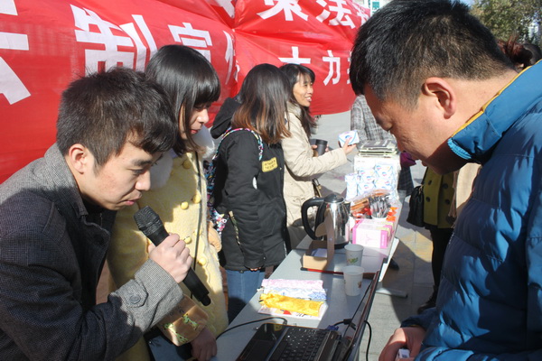 本次公益法制宣傳活動分為兩個階段。第一階段舉行了氛圍熱烈的啟動儀式。未央?yún)^(qū)紀(jì)委、司法局、管理學(xué)院、陜西豐東律師事務(wù)所等相關(guān)部門領(lǐng)導(dǎo)出席啟動儀式并講話,學(xué)生志愿者代表也進(jìn)行發(fā)言,表達(dá)了法律學(xué)子為實現(xiàn)依法治國而勇于奉獻(xiàn)的志向和熱情。第二階段展開了有聲有色的普法宣傳活動,學(xué)生志愿者們制作精美的普法知識手冊和反腐倡廉畫冊,播放了《法律進(jìn)社區(qū):公民見解+專家點評+律師服務(wù)》的普法宣傳片,開展了形式活潑的法律知識有獎問答活動,并在陜西豐東律師事務(wù)所普法團(tuán)隊和法學(xué)系老師的幫助下,為現(xiàn)場群眾提供法律咨詢、解答法律問題。活動得到了西安晚報記者及社會熱心人士的積極參與,西安市書法愛好者吳永鋒老師到現(xiàn)場展示廉政法律文化書法作品,并為參與普法活動的獲獎市民者贈送墨寶。