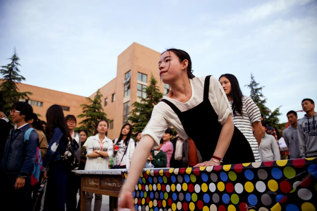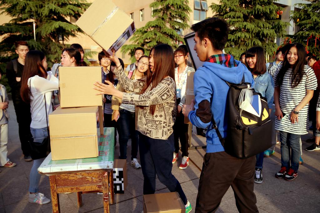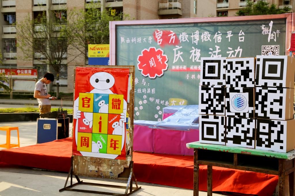 2015年4月21-23日,為了感謝大家的支持,拉近與小伙伴們的距離,官微在自己的一周歲生日會期間舉辦線上和線下活動,給一直以來默默支持的小伙伴們發福利!線下活動于4月21日下午6點在沁園廣場展開,通過二維碼拼圖、打沙包、限時搶大禮三個環節來贏取大禮。傍晚的廣場上比賽激烈、熱鬧非凡,加油聲、掌聲、笑聲、喝彩聲不絕于耳,令人記憶深刻的是官微“寶箱”中不僅有洗衣粉、香皂、插線板等日用品,還有陜科大老校區的明信片、印有官微二維碼的雨傘、獨家定制的陜西話小課堂CD等。活動時間正逢學生下課,來往同學紛紛加入到比賽的當中。小伙伴紛紛感嘆“活動真給力,搶到的都是你的”。