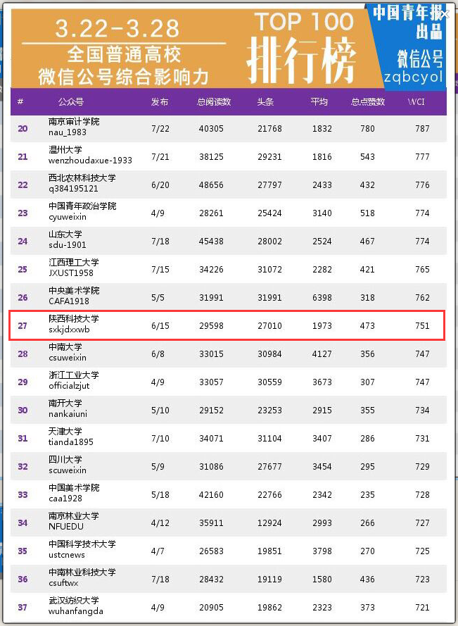 官微的社會影響力在不斷擴大,繼去年《我們的十年丨老校區的時光相冊》以高達19102次的閱讀量位列全國第四之后,《有一個科大只有我們知道》以高達17707次的閱讀量位列全國第二十三。同時,在中國青年報統計并發布“3.22-3.28日 top100全國高校微信公眾號綜合能力排行榜”中,我校以27010次閱讀總數、751分的微信傳播綜合指數(WCI)位居全國第二十七位。