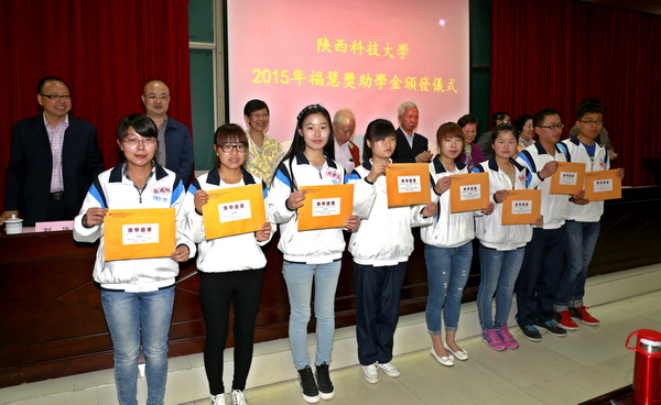 學工部部長劉運宣讀了《陜西科技大學2015年福慧慈善基金會愛心獎助學金受助學生名單》,共有86名同學獲得了10萬元的獎助學金。香港福慧慈善基金會的嘉賓和與會領導為受助學生頒發了證書和獎助學金。