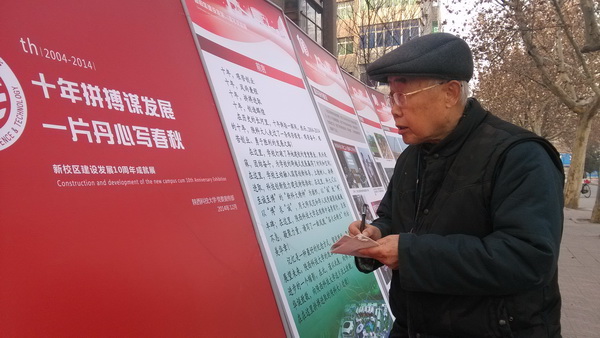 2014年12月25日至2015年1月4日,“十年拼搏謀發(fā)展 一片丹心寫春秋——新校區(qū)建設(shè)發(fā)展10周年成就展”先后在西安校區(qū)迎賓大道和咸陽校區(qū)舉行。展覽凸顯“異地建設(shè)速度快,以人為本建住宅,五年清償銀行債”的新校區(qū)建設(shè)三大特點(diǎn),通過基本條件建設(shè)、人才培養(yǎng)、學(xué)科建設(shè)與研究生教育、科研成果、校園文化、對(duì)外交流和黨的建設(shè)7大板塊43塊展板,充分展示了學(xué)校主體東移的艱苦創(chuàng)業(yè)和改革發(fā)展的輝煌成就。展覽期間,包括廣大師生員工和離退休老同志在內(nèi)的觀展者絡(luò)繹不絕,機(jī)關(guān)黨委、保障黨委、基建處、材料科學(xué)與工程學(xué)院等單位還組織進(jìn)行了集體參觀。大家在展板前憶往昔、嘆變化,心潮澎湃,感慨萬千,還有人拿起筆記本詳細(xì)記錄,甚至有人流下了激動(dòng)的淚水。電視專題片《十年拼搏 鑄就輝煌》片段《西安校區(qū)建設(shè)紀(jì)實(shí)》片段