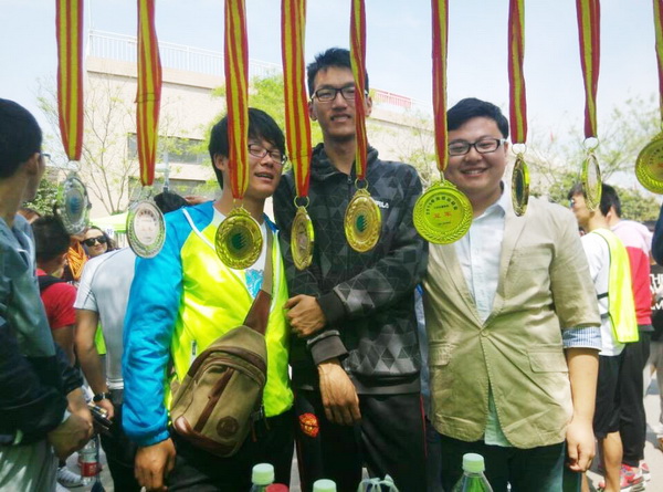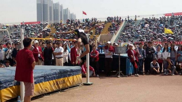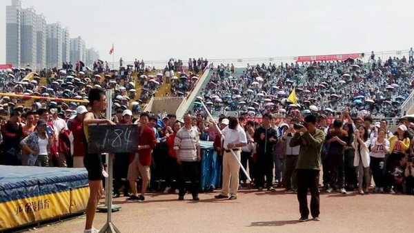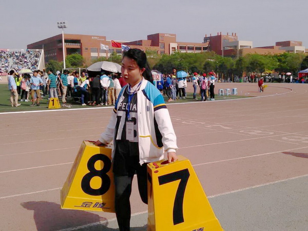 在現(xiàn)場觀眾的熱烈掌聲中,“新科狀元”陳賢星與寫有“1.84”數(shù)字的黑色記錄牌“甜蜜”地合影,讓鏡頭定格在這一輝煌的時刻。這位看起來瘦削的輕工學(xué)院包裝141班的男生,身高193cm,曾在高中時就獲得過重慶市男子跳高比賽的冠軍。同樣的,他對三級跳遠也頗感興趣,在本屆運動會男子三級跳遠決賽中,又以13.45米的成績再次打破校運會記錄。