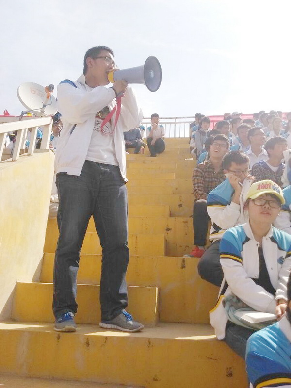 同學(xué)們頂著驕陽,穿著校服有序地坐在看臺上,眼睛齊刷刷地盯著同一個目標(biāo)——導(dǎo)員。他面向大家,發(fā)出鏗鏘有力的聲音:“比賽即將開始,你們要注意代表咱們學(xué)院的運動員,等他們沖刺過來時,大家一定要為他們吶喊助威。我知道今天炎熱依舊,但為了向那些在烈日下仍然拼搏的同學(xué)們,我們要做他們的堅強后盾,要讓他們感受到我們的熱情和真誠,大家一定要堅持下去!”發(fā)話完畢,導(dǎo)員一個轉(zhuǎn)身,無視毒辣的日光照射,屹立在看臺上,時而用嚴(yán)肅面孔、沉默不語之態(tài)維護現(xiàn)場的秩序,時而指揮同學(xué)們,一鼓作氣地加油助威。