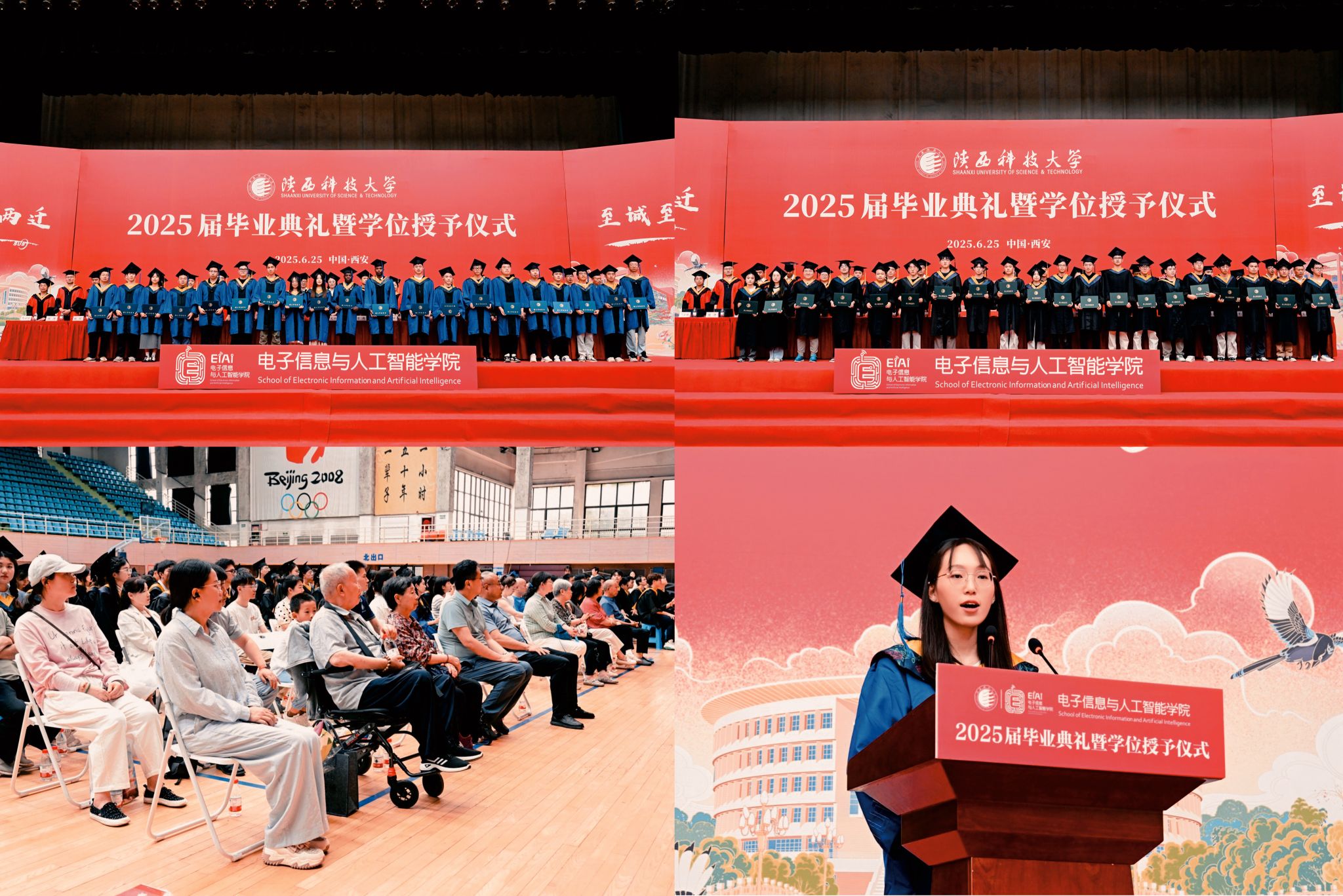 6月25日,電智學(xué)院2025屆畢業(yè)典禮于學(xué)校文體館舉行,典禮以“智青春”為主題,在師生共同見(jiàn)證下,院學(xué)術(shù)委員會(huì)成員為757名學(xué)子撥穗正冠。學(xué)院教師代表王曉發(fā)言,為全體2025屆畢業(yè)生送上飽含深情與期許的寄語(yǔ),優(yōu)秀畢業(yè)生代表許葉彤發(fā)言暢談畢業(yè)感想,增強(qiáng)了全體畢業(yè)生的榮譽(yù)感與歸屬感,為他們深植“感恩”情懷。