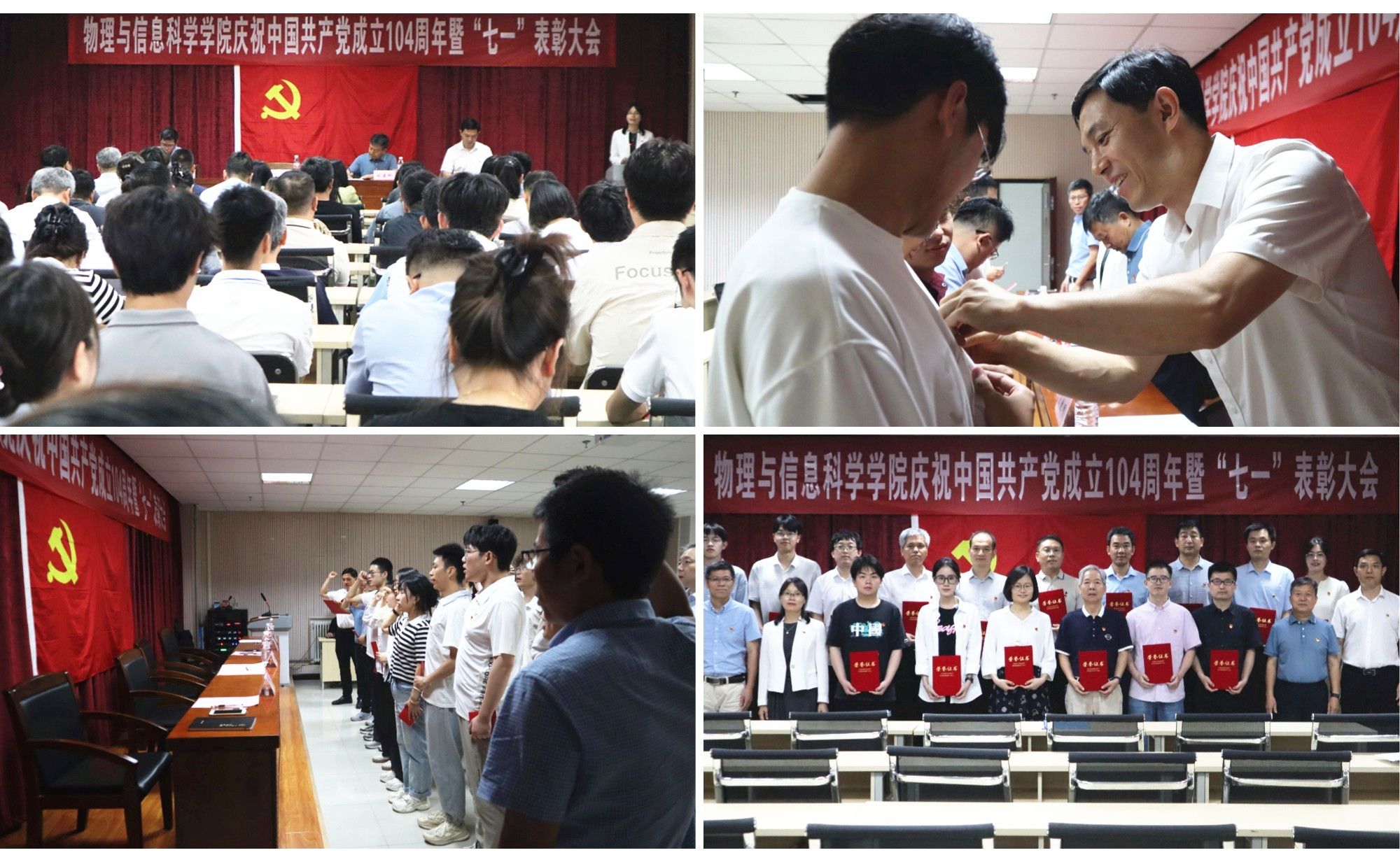 為慶祝中國共產黨成立104周年,表彰先進,樹立典型,物理學院黨委于6月30日舉行慶祝中國共產黨成立104周年暨“七一”表彰大會。學院黨委委員、全體黨員、入黨積極分子代表參加會議,會議由學院黨委副書記王曉明主持。