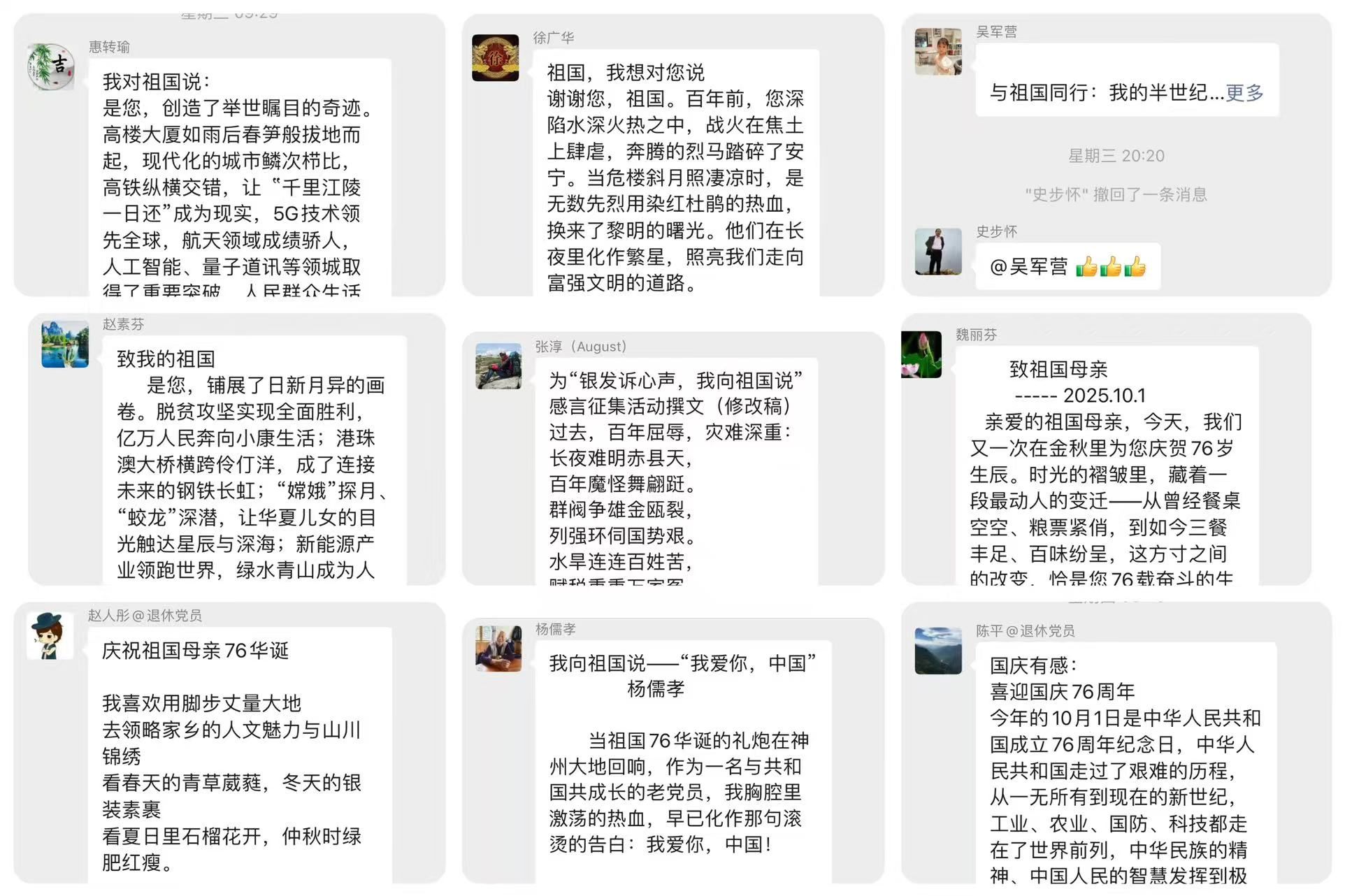為慶祝中華人民共和國成立76周年,抒發對祖國的深切熱愛,凝聚銀發力量,近日,離退處黨委精心組織開展“時光映照初心,銀齡告白祖國”退休黨員慶國慶感言征集活動,五十余位退休老黨員積極響應,以真摯文字訴說家國情懷,用歲月故事詮釋初心使命。