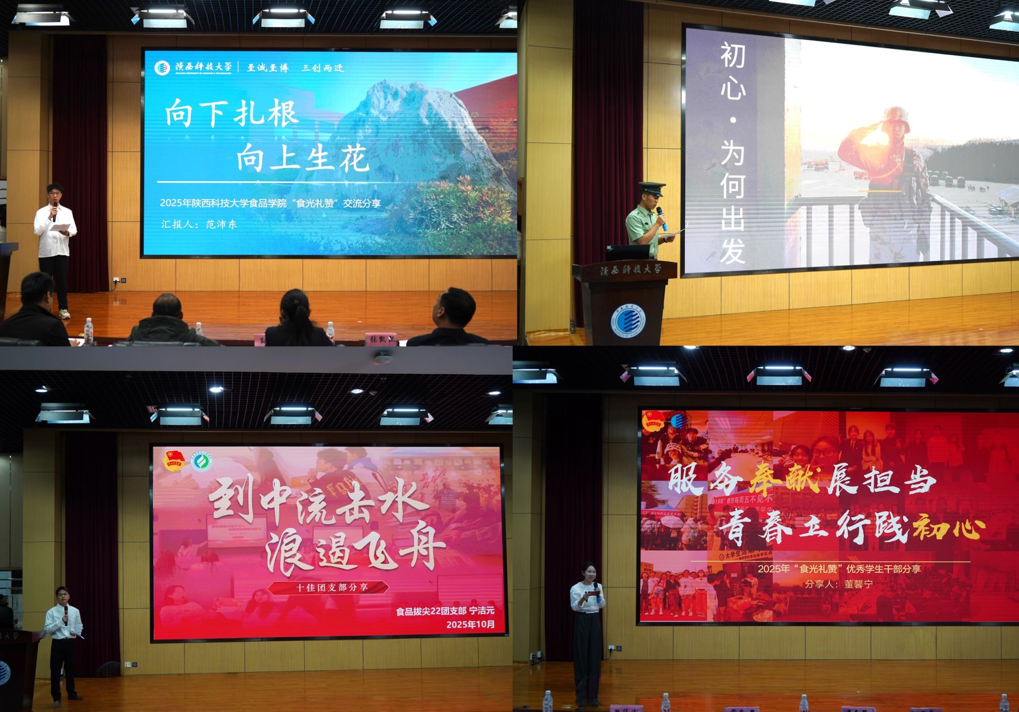 活動以“食光啟航 砥礪前行”為主題,設立“食光”模范獎、“食光”拼搏獎、“食光”衛國獎、“食光”凝聚獎、“食光”卓越獎、“食光”桃李獎等十余個類別的獎項,集中表彰上一年度表現優秀的典型個人和先進集體。優秀學生代表董馨寧、張思雯、三永隆、范沛東和優秀宿舍、十佳團支部等先進集體代表分別分享德智體美勞全面發展的青春故事及集體建設經驗。