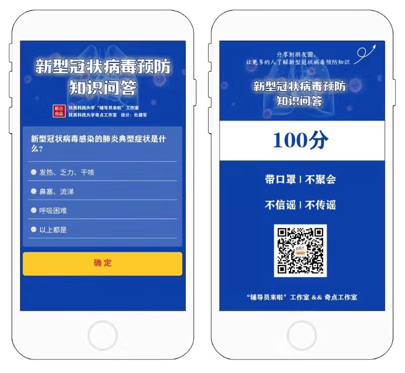 校黨委書記在第三次疫情防控工作專題會議強調,要加強信息發布,做好校園輿情應對工作,加強對師生的教育引導。學校利用官方網站、微博、微信公眾號、各級工作群等發布疫情防控知識普及、致全體師生和學生家長的倡議書,及時向師生員工和學生家長宣傳普及疫情防治知識和防控要求,引導大家加強自我防護、積極面對疫情,齊心協力做好疫情防控工作。1月22日起,《今天,你戴口罩了么?》《陜西科技大學新型冠狀病毒感染的肺炎防控倡議書》《我是陜科大人,我承諾:》《關于新型冠狀病毒肺炎,你必須要知道的事實》等圖文宣傳在校園媒體矩陣不斷發布;2月1日,設置“中央精神”“科大要聞”“通知公告”“防控知識”等欄目的陜科大新型冠狀病毒感染的肺炎防控專題網站正式上線,與此同時,學工部易班中心、學工部官方微信公眾號推出《輔導員傳你病毒不侵大法》《這個假期,我承諾》《袍澤同行,必勝疫情》等多篇網文,呼吁和倡導全校師生員工主動投身疫情防疫戰,充分發揮了強有力的正面引導作用。