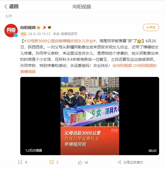 向陽視頻:父母跨3000公里自制橫幅慶祝女兒畢業,周圍同學都羨慕“哭”了