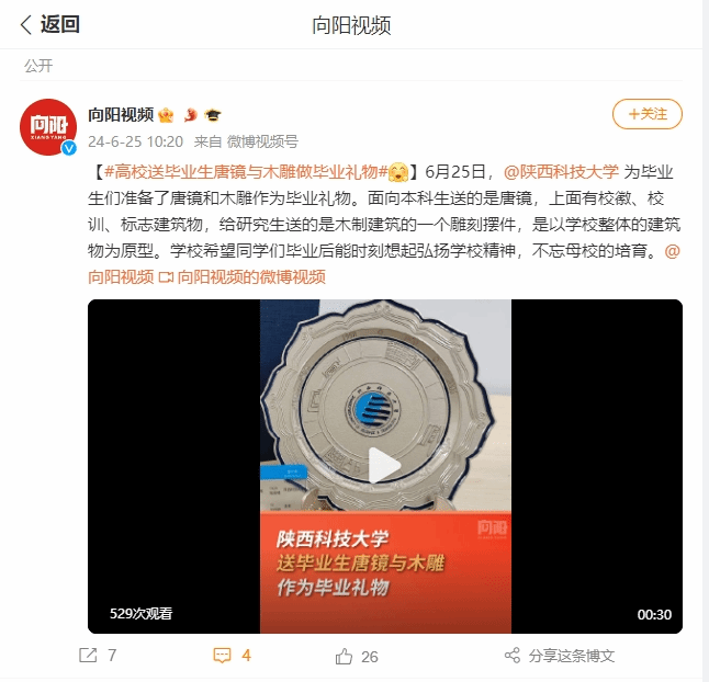 近日,向陽視頻報道我校送畢業生唐鏡與木雕做畢業禮物。