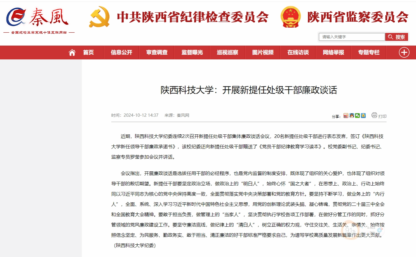 近日,秦風(fēng)網(wǎng)報道我校開展新提任處級干部廉政談話。