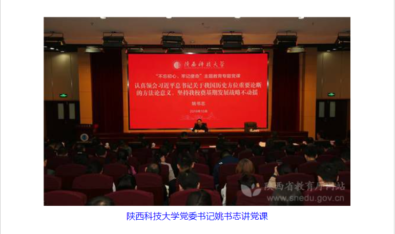 【陜西科技大學】按照中央、省委“不忘初心、牢記使命”主題教育部署安排,10月16日下午,陜西科技大學黨委書記姚書志為全體中層干部(含二級單位助理)、黨支部書記、輔導員講“不忘初心、牢記使命”主題教育專題黨課。專題黨課由該校黨委副書記溫鋒主持。姚書志作了題為“認真領會習近平總書記關于我國歷史方位重要論斷的方法論意義,堅持學校奠基期發展戰略不動搖”的黨課。從認真學習習近平同志關于我國發展歷史方位的重要論斷、體會形勢分析的辯證法;認真掌握形勢分析的辯證法,正確看待學校改革發展的形勢,正確認識省委綜合研判的有關反饋意見;把主題教育作為重大政治任務高標準高質量推進,切實推動學校各項事業發展取得新成績等三個方面,帶領大家深入學習關于我國歷史方位的重要判斷,認真領會其中所蘊含的方法論意義,尤其是要學會運用形勢分析的辯證法,結合學校工作實際,正確認識學校當前改革發展的形勢,鼓舞全校師生凝聚思想、統一認識,鼓足干勁、追趕超越。在這堂黨課的尾聲,姚書志號召全校上下齊心協力、敢于擔當,堅持高標準高質量推進主題教育,不斷推動學校各項事業沿著“三步走”發展戰略持續向好發展,使學校的奠基期更加厚實,做到厚積而薄發,早日實現陜西科技大學復興騰飛的偉大夢想。省委“不忘初心、牢記使命”主題教育第八巡回指導組成員,陜煤集團黃陵礦業公司黨委副書記、紀委書記孫鵬,在校的黨委委員、校領導、校長助理出席。