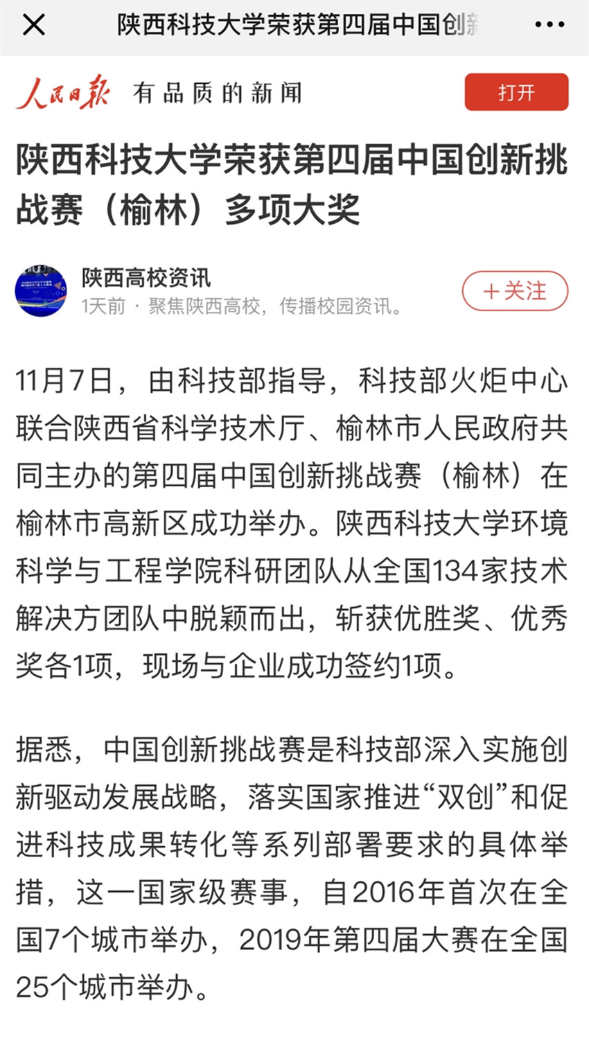 人民日報APP:陜西科技大學榮獲第四屆中國創新挑戰賽(榆林)多項大獎