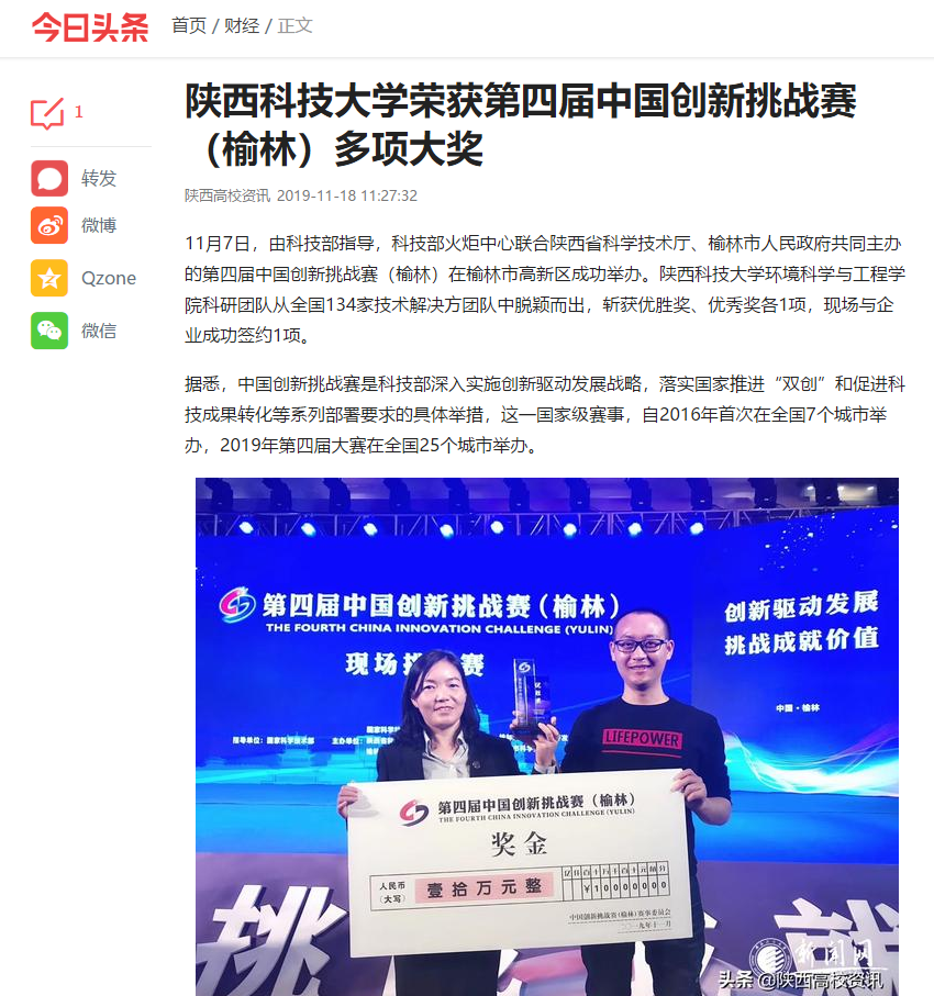 今日頭條:陜西科技大學榮獲第四屆中國創新挑戰賽(榆林)多項大獎