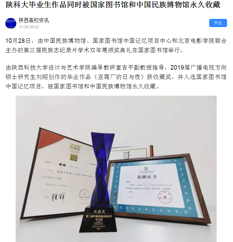 由陜西科技大學設計與藝術學院編導教研室吉平副教授指導,2019屆廣播電視方向碩士研究生劉昭創作的畢業作品《豆腐廠的日與夜》獲收藏獎,并入選國家圖書館中國記憶項目,被國家圖書館和中國民族博物館永久收藏。