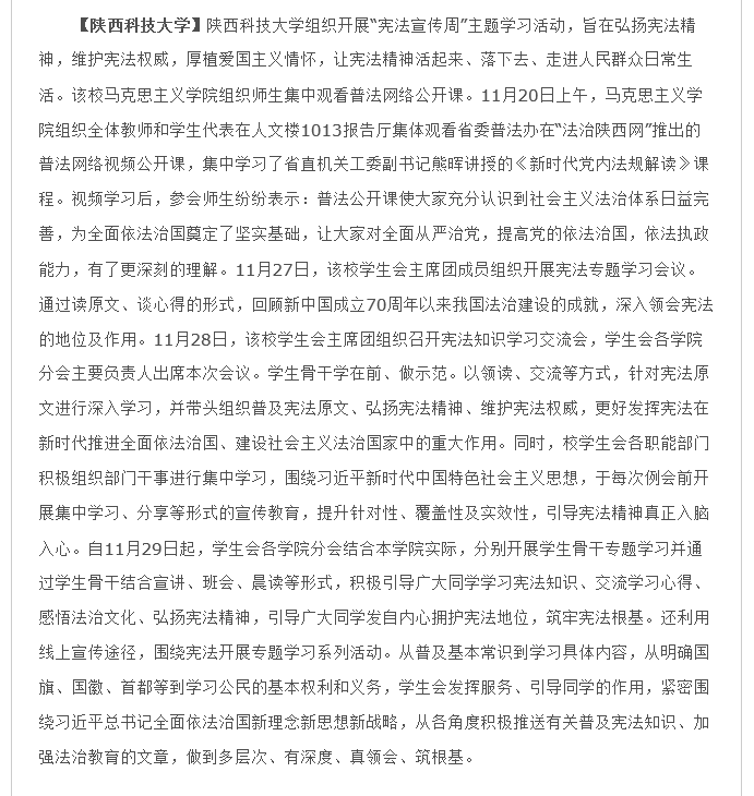 【陜西科技大學】陜西科技大學組織開展“憲法宣傳周”主題學習活動,旨在弘揚憲法精神,維護憲法權威,厚植愛國主義情懷,讓憲法精神活起來、落下去、走進人民群眾日常生活。該校馬克思主義學院組織師生集中觀看普法網絡公開課。11月20日上午,馬克思主義學院組織全體教師和學生代表在人文樓1013報告廳集體觀看省委普法辦在“法治陜西網”推出的普法網絡視頻公開課,集中學習了省直機關工委副書記熊暉講授的《新時代黨內法規解讀》課程。視頻學習后,參會師生紛紛表示:普法公開課使大家充分認識到社會主義法治體系日益完善,為全面依法治國奠定了堅實基礎,讓大家對全面從嚴治黨,提高黨的依法治國,依法執政能力,有了更深刻的理解。11月27日,該校學生會主席團成員組織開展憲法專題學習會議。通過讀原文、談心得的形式,回顧新中國成立70周年以來我國法治建設的成就,深入領會憲法的地位及作用。11月28日,該校學生會主席團組織召開憲法知識學習交流會,學生會各學院分會主要負責人出席本次會議。學生骨干學在前、做示范。以領讀、交流等方式,針對憲法原文進行深入學習,并帶頭組織普及憲法原文、弘揚憲法精神、維護憲法權威,更好發揮憲法在新時代推進全面依法治國、建設社會主義法治國家中的重大作用。同時,校學生會各職能部門積極組織部門干事進行集中學習,圍繞習近平新時代中國特色社會主義思想,于每次例會前開展集中學習、分享等形式的宣傳教育,提升針對性、覆蓋性及實效性,引導憲法精神真正入腦入心。自11月29日起,學生會各學院分會結合本學院實際,分別開展學生骨干專題學習并通過學生骨干結合宣講、班會、晨讀等形式,積極引導廣大同學學習憲法知識、交流學習心得、感悟法治文化、弘揚憲法精神,引導廣大同學發自內心擁護憲法地位,筑牢憲法根基。還利用線上宣傳途徑,圍繞憲法開展專題學習系列活動。從普及基本常識到學習具體內容,從明確國旗、國徽、首都等到學習公民的基本權利和義務,學生會發揮服務、引導同學的作用,緊密圍繞習近平總書記全面依法治國新理念新思想新戰略,從各角度積極推送有關普及憲法知識、加強法治教育的文章,做到多層次、有深度、真領會、筑根基。