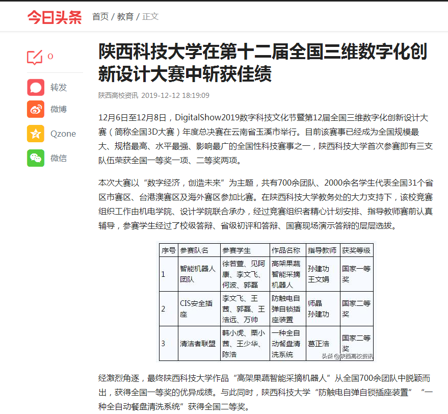 今日頭條APP:陜西科技大學在第十二屆全國三維數字化創新設計大賽中斬獲佳績