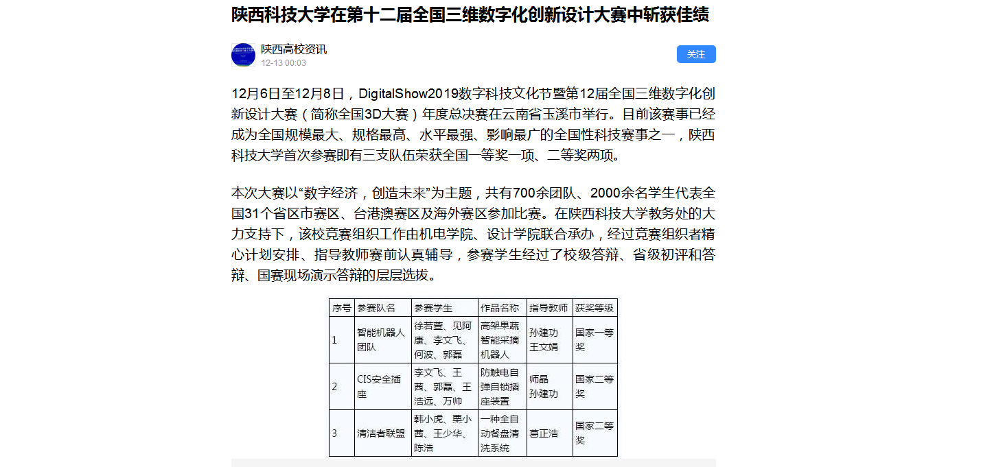 人民日報APP:陜西科技大學在第十二屆全國三維數字化創新設計大賽中斬獲佳績