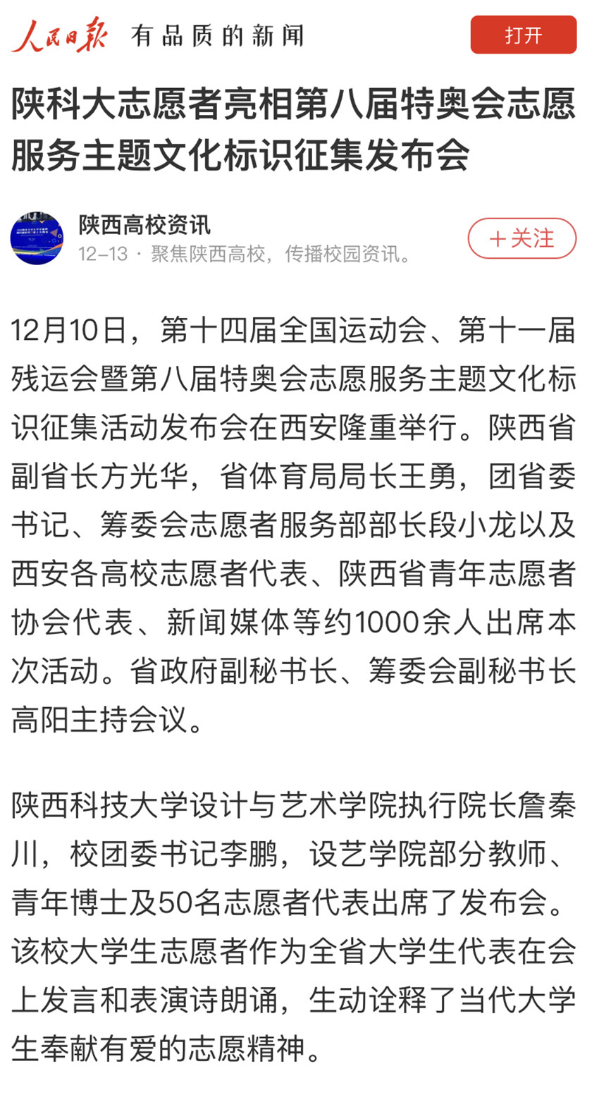 人民日報APP:陜科大志愿者亮相第八屆特奧會志愿服務主題文化標識征集發布會