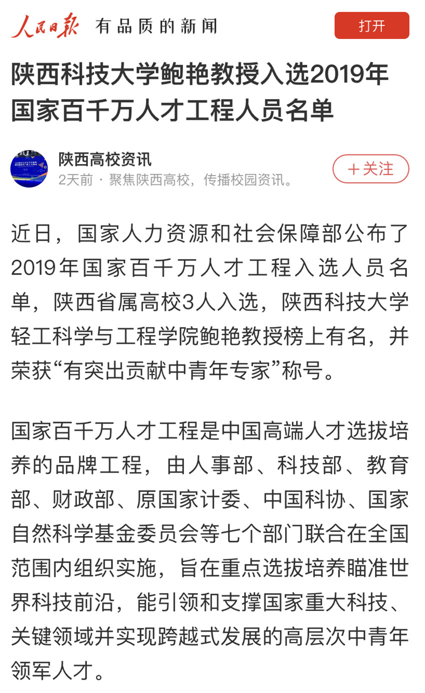 人民日報APP:陜西科技大學(xué)鮑艷教授入選2019年國家百千萬人才工程人員名單