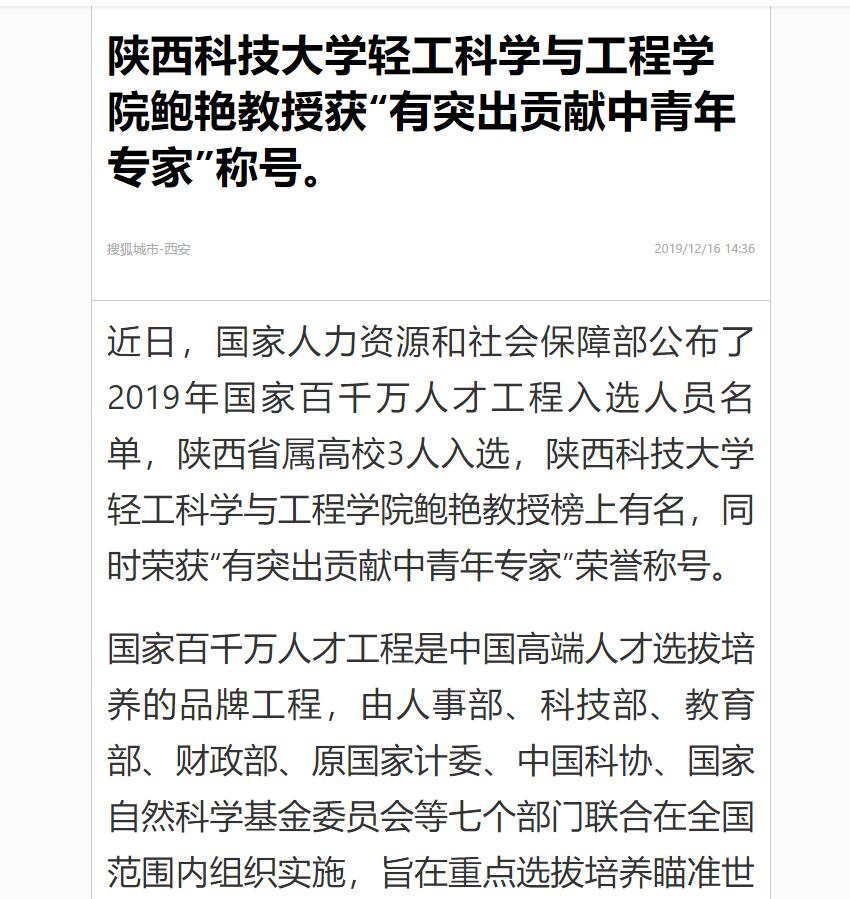 搜狐新聞:陜西科技大學(xué)輕工科學(xué)與工程學(xué)院鮑艷教授獲“有突出貢獻中青年專家”稱號