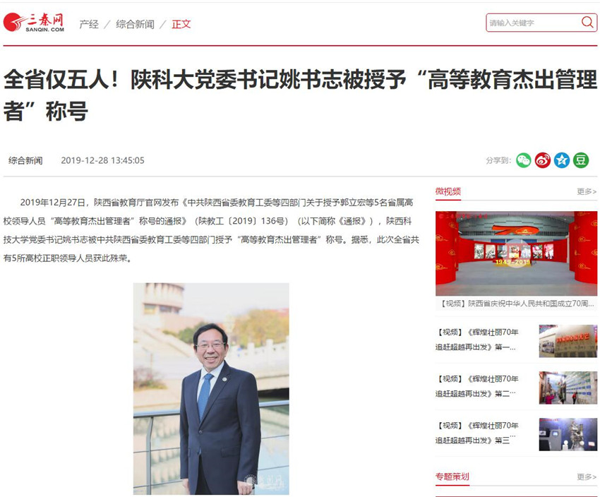 三秦網:全省僅五人!陜科大黨委書記姚書志被授予“高等教育杰出管理者”稱號