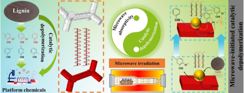 王文亮副教授等提出了一種微波響應(yīng)型催化劑,并成功用于克量級(jí)木質(zhì)素解聚蒸氣的微波輔助催化重整,為從資源豐富的木質(zhì)素中規(guī)模化獲取關(guān)鍵的酚類和芳香烴類平臺(tái)化合物提供了行之有效的途徑。該研究發(fā)表于國(guó)際頂級(jí)期刊Applied Catalysis B: Environmental和Chemical Engineering Journal。
