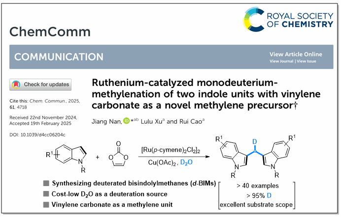 碳酸亞乙烯酯(VC)作為C2、C3合成子已得到廣泛而深入的研究,但作為C1合成子偶聯片段的開發與應用卻相對匱乏。南江團隊近期成功開發了一種釕催化吲哚類化合物與碳酸乙烯酯(VC)的單氘甲基化偶聯反應,并以此構建結構多樣的氘化雙吲哚甲烷衍生物(d-BIMs)。該方法的顯著優勢體現在:1)創新性采用廉價易得的VC作為新型氘代亞甲基前體;2)成功實現藥物分子的后期氘代修飾與功能化。該策略為開發氘標記生物活性分子提供了新思路與新途徑。相關成果以“Ruthenium-catalyzed monodeuterium-methylenation of two indole units with vinylene carbonate as anovel methylene precursor”為題發表在自然指數期刊Chemical Communications上,實驗工作主要由2022級碩士生徐露露完成。