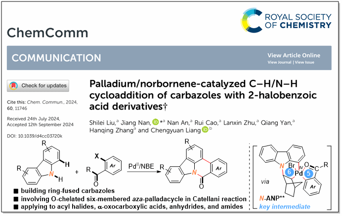 傳統的Catellani反應從最初的芳基碘化物通過金屬鈀(0)與NBE的五元鈀雜環協同催化,將C-H活化、偶聯反應與降冰片烯的遷移插入巧妙結合,在單一步驟中完成芳環上官能團的引入。南江團隊發展了一種鈀/降冰片烯(NBE)以六元鈀雜環參與轉化的協同催化體系,成功實現了2-溴苯甲酸與咔唑類化合物的C-H/N-H環加成反應。該工作不僅拓展了Catellani反應底物的多樣性,更從機理層面豐富了過渡金屬催化劑鈀物種的多樣性。該工作以“Palladium/norbornene-catalyzed C–H/N–Hcycloaddition of carbazoles with 2-halobenzoic acid derivatives”為題為題發表在自然指數期刊Chemical Communications上,實驗工作主要由2023級博士生劉石磊完成。