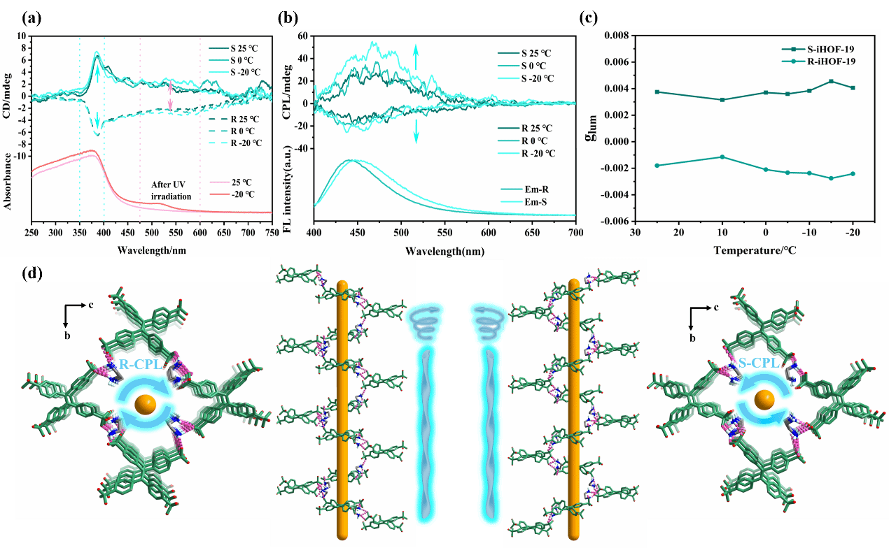 (2). (2).R/S-DPEN的手性基團通過與H4TPE自組裝后手性尺度得到放大可以獲得更高的glum值。手性胺陽離子的作用使得R/S-iHOF-19具有良好的圓偏振發光性質,并且在溫度降低的過程中R/S-iHOF-19的圓偏振發光性能不段增強。通過氫鍵和離子鍵作用實現了手性信號的傳遞和放大。