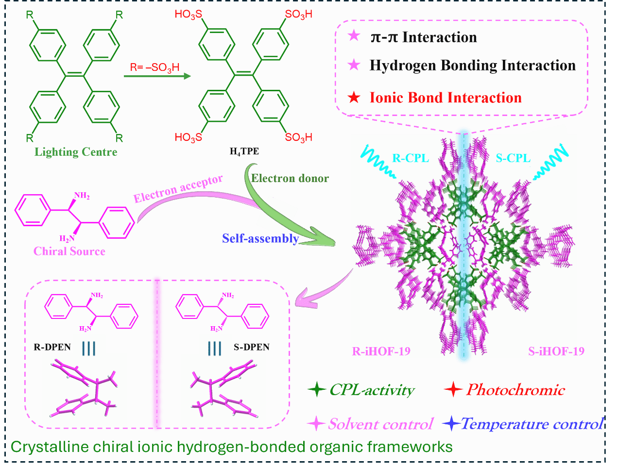 近日,我?;W院曹麗慧教授團隊通過離子型氫鍵有機框架(iHOFs)具有豐富的氫鍵受體和多樣性的結構框架特性;利用它(分子共軛、質子化效應、電荷轉移和可逆結構轉變)不同的光衰減路徑,設計得到了R/S-iHOF-19多功能的光學功能集合體。另外,氫鍵的鍵能要低于共價鍵的鍵能,更容易實現局部位點的斷鍵和二次成鍵,達到對材料性能的進一步精準調控。實現了刺激響應型低溫光致變色、熒光、圓偏振發光等多種光學功能集成的晶態手性框架構筑。并且探索了R/S-iHOF-19未來在多重高級加密防偽方面的潛在應用。這項工作代表了為數不多的低溫刺激響應型晶態手性超分子自組裝材料的系統研究,也表明了離子型氫鍵有機框架(iHOF)可以作為一個新的材料設計策略,為新材料的設計、開發、探索提供可參考的研究模型。相關工作在《Angew. Chem. Int. Ed》期刊上以“Temperature and Solvent Dual Switch Photochromic Chiral lonic Hydrogen-Bonded Organic Framework for circularly Polarized Luminescence and Advanced Encryption”為題發表,陜西科技大學為唯一通訊單位,化學與化工學院2024級博士研究生周斌為論文的第一作者,曹麗慧教授為唯一通訊作者。