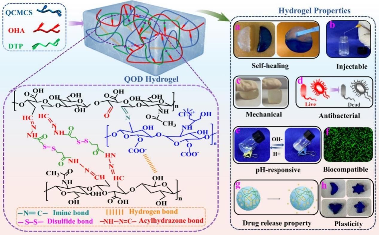 藥物釋放是治療人類各種疾病的有效手段,因此在生物醫(yī)學(xué)領(lǐng)域構(gòu)建合適的藥物釋放載體非常重要。本團(tuán)隊(duì)開發(fā)了一種以季銨化羧甲基殼聚糖(QCMCS)、氧化透明質(zhì)酸(OHA)、3,3′-二硫雙-(丙酰肼)(DTP)為原料合成具有優(yōu)異性能的水凝膠,作為藥物釋放的載體。水凝膠是通過簡單的“一鍋法”制備的,無需外部刺激,基于形成的動(dòng)態(tài)共價(jià)鍵(亞胺鍵、酰腙鍵、二硫鍵)和氫鍵之間的相互作用。水凝膠具有快速自愈特性,30分鐘后自愈率為96%,以及良好的pH反應(yīng)性和出色的細(xì)胞相容性(細(xì)胞存活率高達(dá)98%)。水凝膠的壓應(yīng)力達(dá)到423 kPa。此外,一種代表性藥物 (乙酰水楊酸) 在水凝膠中顯示出持續(xù)釋放(>72 h)。動(dòng)力學(xué)模型顯示藥物釋放行為與Fick擴(kuò)散機(jī)制一致,研究結(jié)果表明QCMCS + OHA + DTP可注射自修復(fù)水凝膠是構(gòu)建pH控制藥物遞送平臺(tái)的潛在材料。相關(guān)研究成果以“Rapid self-healing carboxymethyl chitosan/hyaluronic acid hydrogels with injectable ability for drug delivery”為題發(fā)表在國際期刊Carbohydrate Polymers(文章鏈接:https://doi.org/10.1016/j.carbpol.2023.121707)