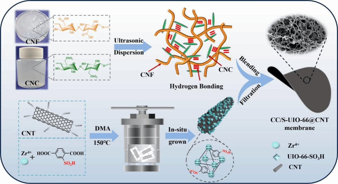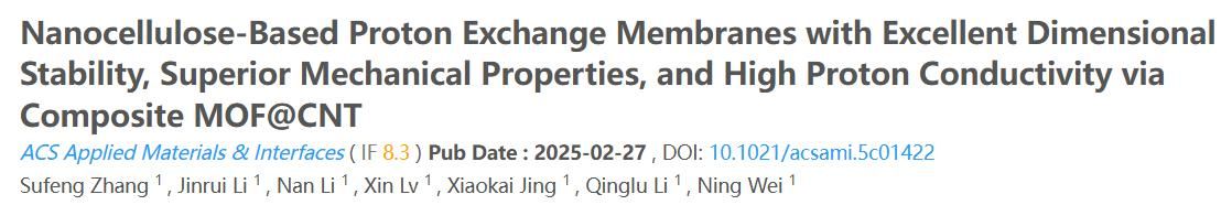 本團(tuán)隊(duì)還通過納米纖維素復(fù)合MOF@CNT,制備了一種可用于燃料電池的質(zhì)子交換膜,以CNFs 和CNCs的復(fù)合材料為基體,然后在CNT表面原位生長 S-UIO-66,然后將其作為填料添加到基體中。值得注意的是,S-UIO-66在CNT表面的原位生長不僅促進(jìn)了CNTs 的均勻分散,而且有效地保證了S-UIO-66在 CNF/CNC基體中的分布。此外,CNF/CNC基體的高電負(fù)性進(jìn)一步增強(qiáng)了這種色散效應(yīng)和穩(wěn)定性,而 S-UIO-66@CNT 促進(jìn)了有效的質(zhì)子傳導(dǎo)。此外,S-UIO-66 和CNT出色的機(jī)械強(qiáng)度和化學(xué)穩(wěn)定性顯著提高了CNF/CNC基體的穩(wěn)定性。由于這些協(xié)同優(yōu)勢,CC/S-UIO-66@CNT-5復(fù)合膜的質(zhì)子電導(dǎo)率在80 °C和100% RH下達(dá)到0.105 S/cm,在80 °C和33% RH下達(dá)到27 mS/cm,同時(shí)還表現(xiàn)出令人印象深刻的 93 MPa 機(jī)械強(qiáng)度和顯著的尺寸穩(wěn)定性。相關(guān)研究成果以“Nanocellulose-Based Proton Exchange Membranes with Excellent Dimensional Stability, Superior Mechanical Properties, and High Proton Conductivity via Composite MOF@CNT”為題發(fā)表在國際期刊ACS Applied Materials & Interfaces(文章鏈接:https://doi.org/10.1021/acsami.5c01422)
