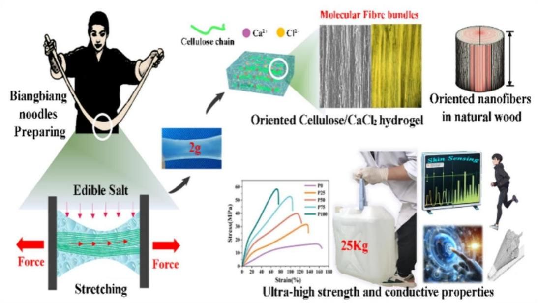 本團(tuán)隊(duì)研究了一種通過定向預(yù)拉伸和溶劑置換結(jié)合制備超強(qiáng)超韌導(dǎo)電水凝膠的策略,成功地模擬了纖維在木材中的定向排列,減少了相鄰區(qū)域之間的平均距離,并大大提高了水凝膠的力學(xué)性能。然后引入金屬離子以形成金屬離子配位鍵,從而實(shí)現(xiàn)各種特性的多功能耦合,包括高拉伸應(yīng)變、保水性、導(dǎo)電性和抗凍性。水凝膠具有優(yōu)異的機(jī)械性能,具有極高的拉伸強(qiáng)度(52.79 ± 0.24 MPa)、楊氏模量(287 ± 20 MPa)、斷裂韌性(34.41 ± 2.89 MJ m?3)、斷裂應(yīng)變(104.6 ± 2 %)和離子電導(dǎo)率(11.73 ± 0.06 mS m?1),在?80 °C下冷凍7天后,力學(xué)性能和電導(dǎo)率保持與冷凍前相同的水平。其出色的多功能性可應(yīng)用于需要高強(qiáng)度且在極端環(huán)境中作的機(jī)器人軟組織(如跟腱)。相關(guān)研究成果以“Ultra-strong and tough cellulose-based conductive hydrogels via orientation inspired by noodles pre-stretching”為題發(fā)表在國際期刊Carbohydrate Polymers(文章鏈接:https://doi.org/10.1016/j.carbpol.2024.122286)。