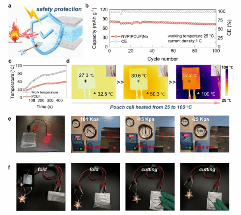 圖4:基于PCUF電解質準固態鈉金屬軟包電池性能及安全性能測試