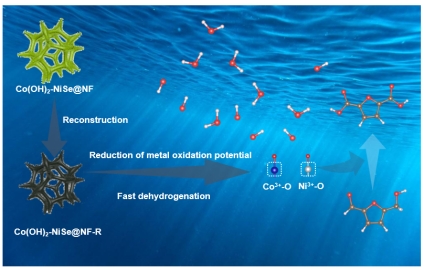 團隊開發出一種通過電化學重構制備的高效電催化劑Co(OH)2-NiSe@NF-R,成功實現5-羥甲基糠醛(HMF)電催化氧化制備2,5-呋喃二甲酸(FDCA)的高選擇性轉化。研究團隊通過設計Co(OH)2-NiSe@NF前驅體,在堿性介質中經電化學重構形成富含高價活性位點(CoOOH和NiOOH)的催化劑表面。研究揭示了Co(OH)2-NiSe@NF重構機理:重構過程中硒元素被氧化為硒酸鹽(SeO42-)并附著于氫氧化物表面,通過降低晶格羥基脫氫能壘,促進高價金屬活性位點的形成。該工作以“Revealing the electrochemical reconstruction behavior of Co(OH)2-NiSe for efficient the electrooxidation of 5-hydroxymethylfurfural”為題發表在《Chemical Engineering Journal》。23級博士生朱嘉琦為第一作者,王偉濤副教授、劉昭鐵教授和韓布興研究員為通訊作者。
