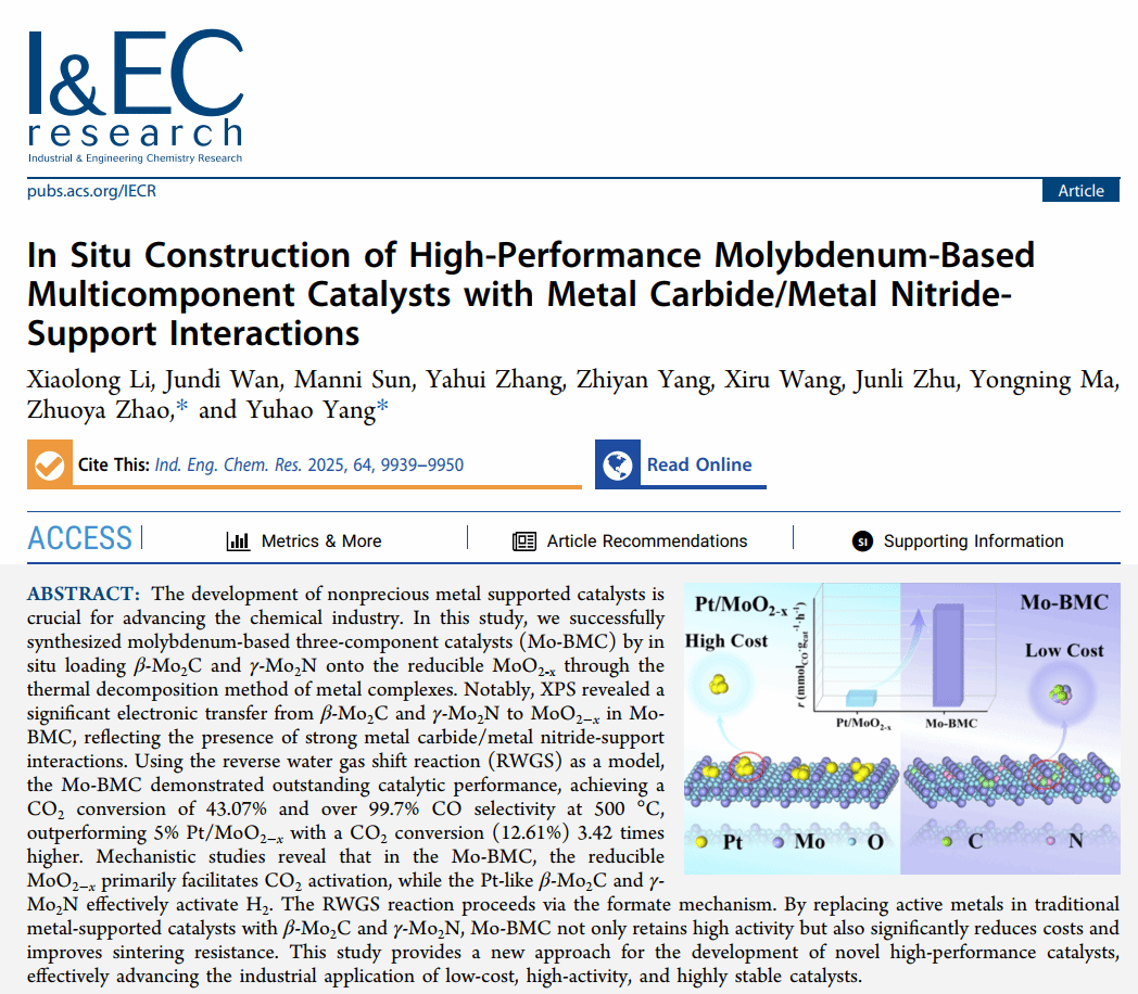 團(tuán)隊(duì)采用金屬絡(luò)合物原位熱分解法,在可還原載體MoO???上原位生成β-Mo?C與γ-Mo?N,成功構(gòu)建出具有類(lèi)貴金屬特性的鉬基三組分催化劑—Mo-BMC。以逆水煤氣變換反應(yīng)(RWGS)為模型反應(yīng),Mo-BMC在500 °C下實(shí)現(xiàn)CO?轉(zhuǎn)化率43.07%、CO選擇性超99.7%,性能為同條件下5%Pt/MoO???的3.42倍。機(jī)理研究標(biāo)明MoO???是CO?的活性中心,而β-Mo?C和γ-Mo?N是H?的活性中心,反應(yīng)經(jīng)甲酸鹽路徑進(jìn)行。該策略以非貴金屬替代傳統(tǒng)金屬活性中心,展示了以類(lèi)貴金屬化合物替代傳統(tǒng)貴金屬的有效途徑,在保證催化性能的同時(shí)降低催化劑成本、提高抗燒結(jié)穩(wěn)定性方面具有顯著優(yōu)勢(shì)。研究成果以題為 “In Situ Construction of High-Performance Molybdenum-Based Multicomponent Catalysts with Metal Carbide/Metal Nitride-Support Interactions” 發(fā)表在《Industrial & Engineering Chemistry Research》。該工作主要由2022級(jí)碩士研究生萬(wàn)俊弟完成。https://doi.org/10.1021/acs.iecr.5c00319