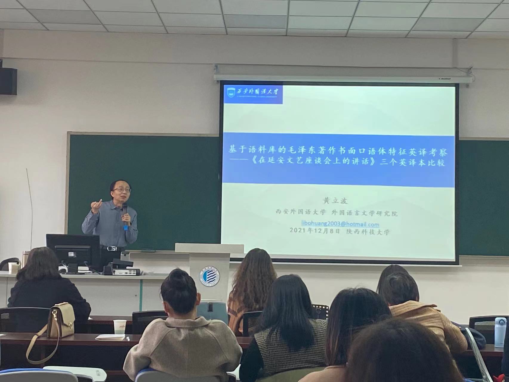 12月8日下午,應文理學院邀請,西安外國語大學黃立波教授做客我校前沿科學報告,作了題為《基于語料庫的毛澤東著作書面口語體特征英譯考察——<在延安文藝座談會上的講話>三個英譯本比較》的報告。報告由外語系主任李俊葉主持,外語系教師和翻譯專業研究生聆聽了此次報告。