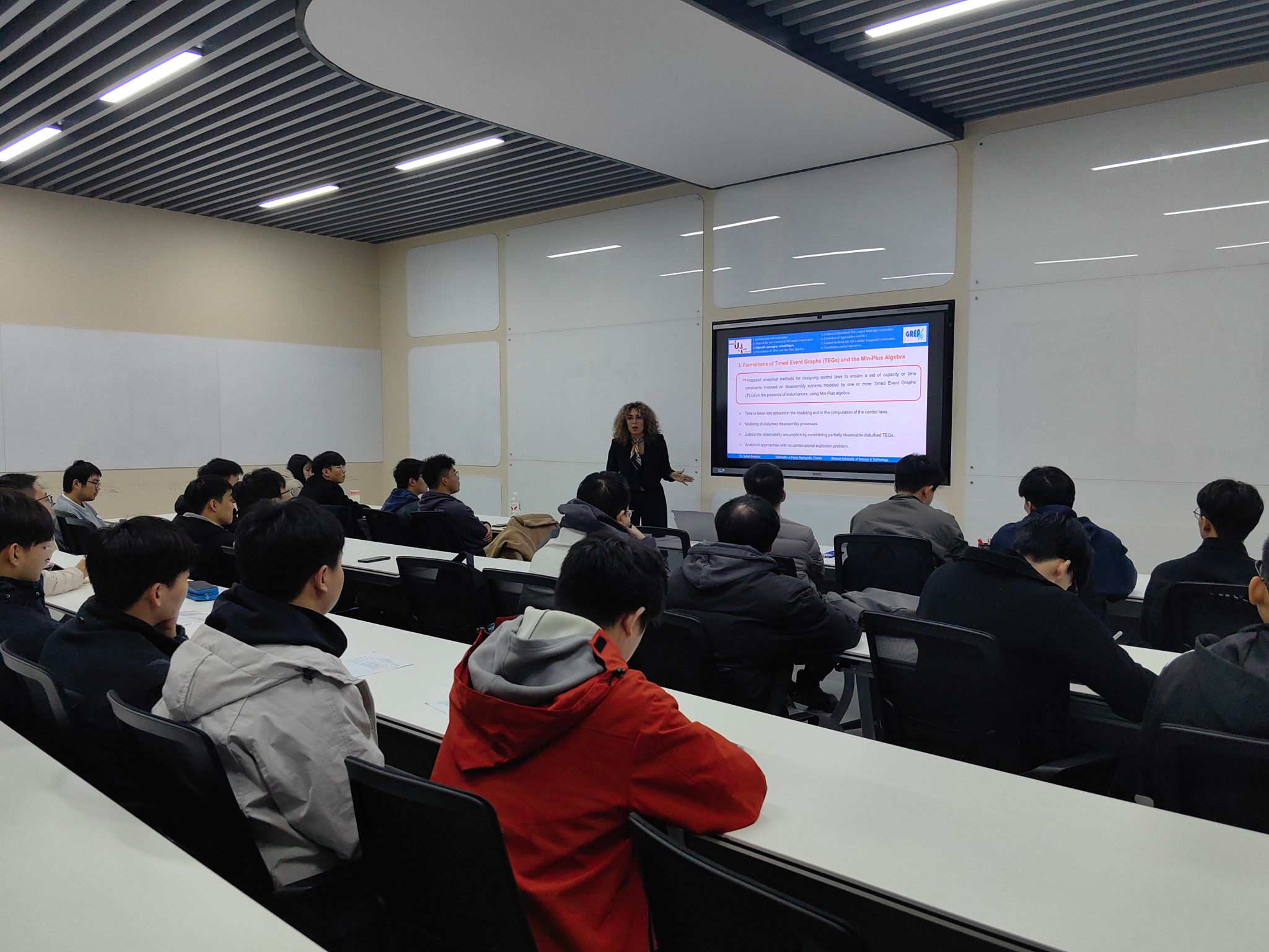 10月20日下午,Bouazza副教授作題為《Control of discrete event systems subject to mutual exclusion and mixed constraints using Min Plus algebra》的學術報告。該報告聚焦離散事件系統控制領域的前沿問題,系統梳理了在智能制造、交通調度和網絡安全等關鍵領域,離散事件系統(DES)的實時控制面臨核心挑戰:如何高效處理資源互斥沖突(如設備共享沖突)與混合約束(如時序邏輯與物理限制的協同)。報告結合可再生能源在運輸與物流系統中的集成案例,展示Min Plus代數在能效優化與實時控制中的獨特優勢,并討論其與現有離散事件系統控制方法的協同效應。